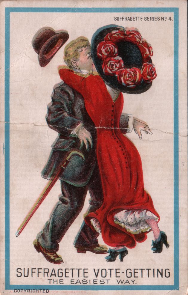On the front side of my featured postcard, it says, “Suffragette Vote-Getting, The Easiest Way”. The word suffragette means: “A woman who worked to get voting rights for women in the past when women were not allowed to vote”.
