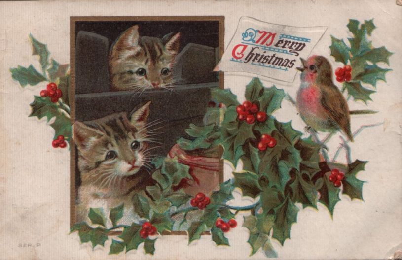 My featured image postcard, with the kittens and bird, was postmarked in 1909, sent by a Cousin from Hartford, Conn. I cannot quite make out the name of the sender. The message side was written in pencil and is very hard to read; therefore, I am not posting the reverse side here.