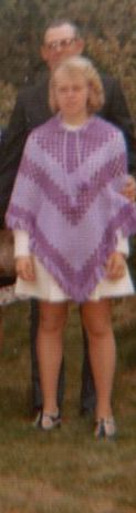 As I remember it, Grammy was never very idle. In the evenings, while sitting in her chair, her hands were always in motion with knitting or crocheting. She made all kinds of things with yarn: afghans by making squares and then lacing them together; covers for throw pillows, slipper socks, baby booties and blankets. One time she made me a beautiful purple poncho shawl, as seen in the (slightly blurry) picture below, my dad standing in back of me–I still have that shawl.