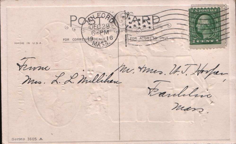 This postcard was published by Stecher Litho Co. (1887-1936), it has a series number 1605A. It was postmarked December 29, 1916, from Milford, Mass. The card was sent to Mr. and Mrs. W. J. Hooper (Aunt Etta and her husband) and the sender was Mrs. L. L. Milliken.