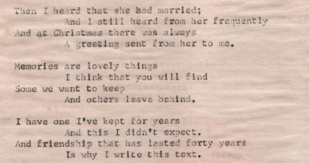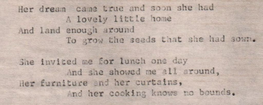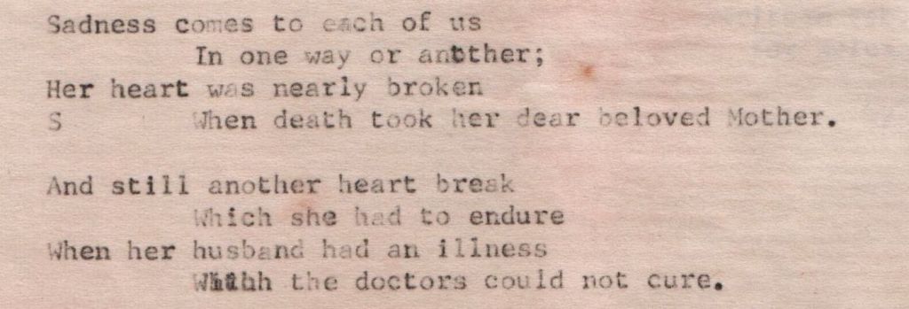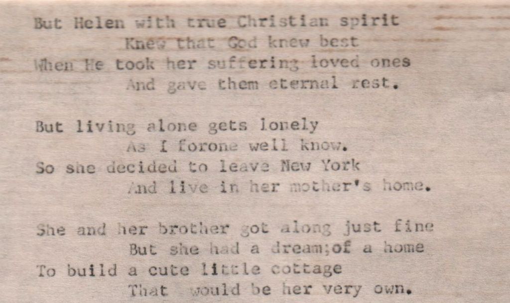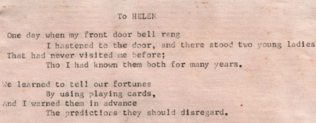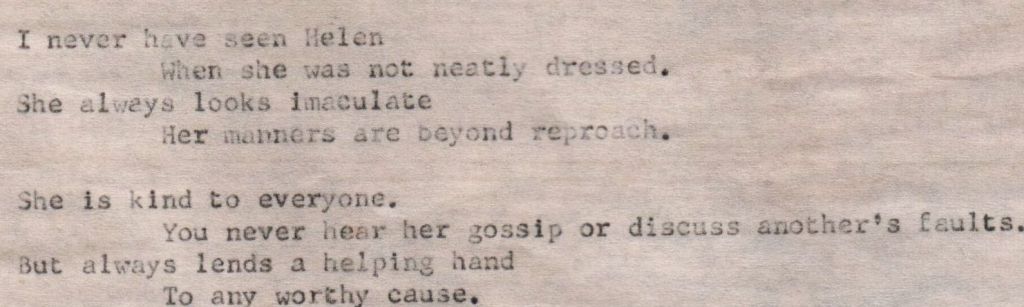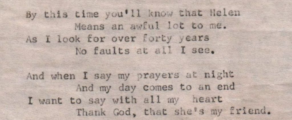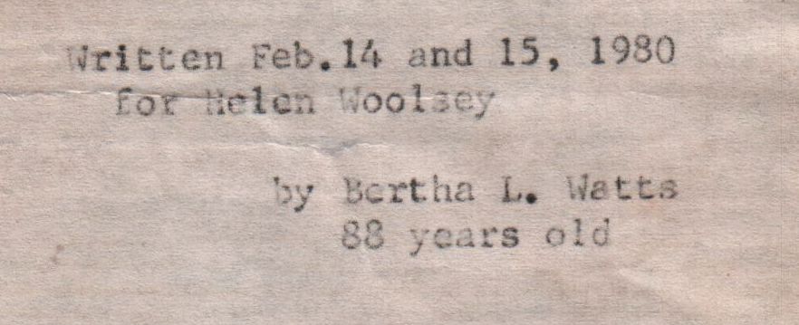 At the age of eighty-eight, my adoptive grandmother, Bertha L. Watts (Gra Gra) wrote a poem about her dear friend Helen L. (Sykes) Woolsey (1907-1998). I have mentioned in previous blog postings that Gra Gra was a poet. Her mind was sharp as a tack right up to the end. To be able to write such a poem at an advanced age shows how clear her mind was. However, she was legally blind well before that point; so, it meant that she would have had to dictate the poem to someone else and then someone typed it up for her.
